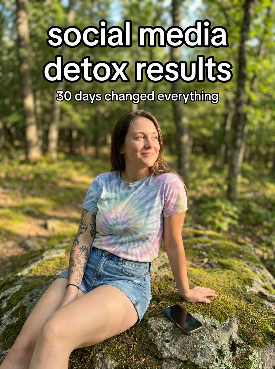 model in social media detox outfit in nature or peaceful setting, phone put away, serene expression, natural lighting. TikTok-style text overlay with white text with black outline: "social media detox results" smaller text: "(30 days changed everything)" , do not show tiktok interface or logo