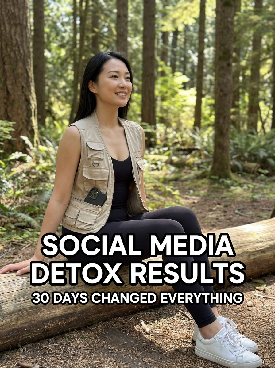 model in social media detox outfit in nature or peaceful setting, phone put away, serene expression, natural lighting. TikTok-style text overlay with white text with black outline: "social media detox results" smaller text: "(30 days changed everything)" , do not show tiktok interface or logo