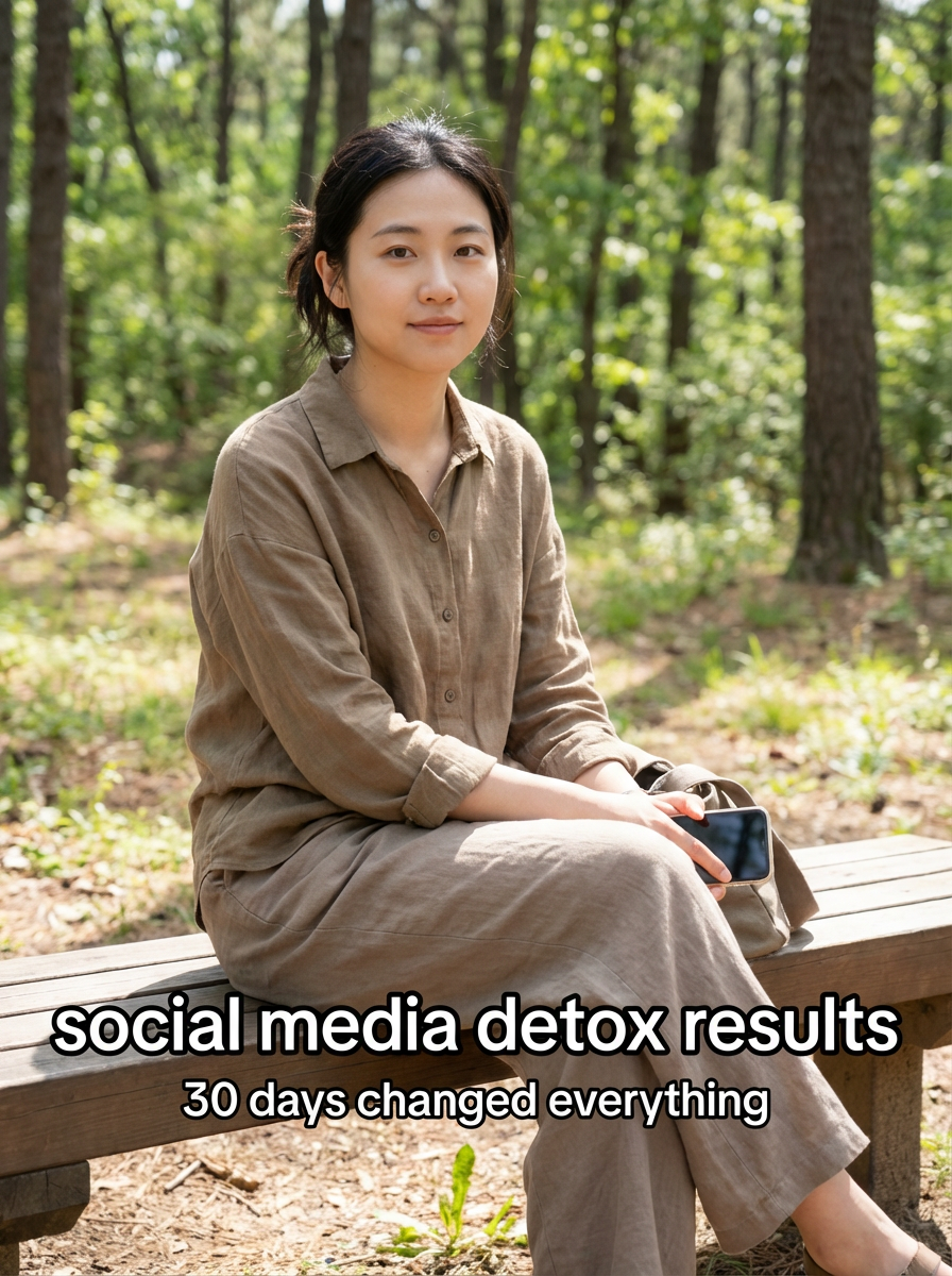 model in social media detox outfit in nature or peaceful setting, phone put away, serene expression, natural lighting. TikTok-style text overlay with white text with black outline: "social media detox results" smaller text: "(30 days changed everything)" , do not show tiktok interface or logo