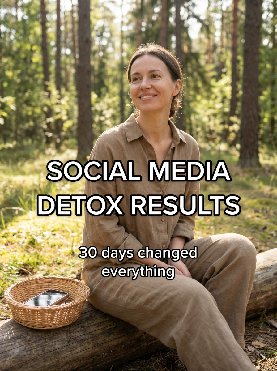 model in social media detox outfit in nature or peaceful setting, phone put away, serene expression, natural lighting. TikTok-style text overlay with white text with black outline: "social media detox results" smaller text: "(30 days changed everything)" , do not show tiktok interface or logo