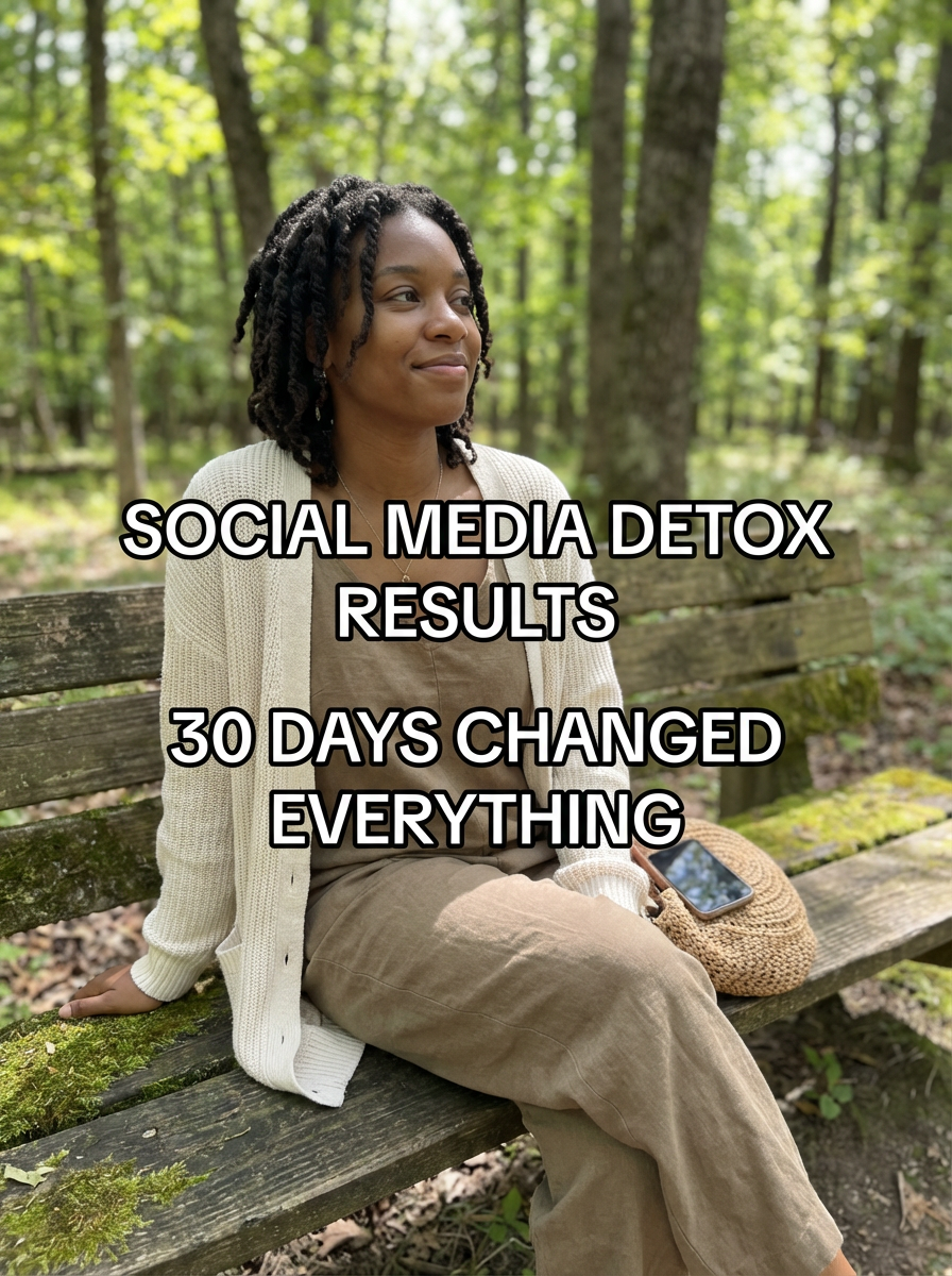 model in social media detox outfit in nature or peaceful setting, phone put away, serene expression, natural lighting. TikTok-style text overlay with white text with black outline: "social media detox results" smaller text: "(30 days changed everything)" , do not show tiktok interface or logo