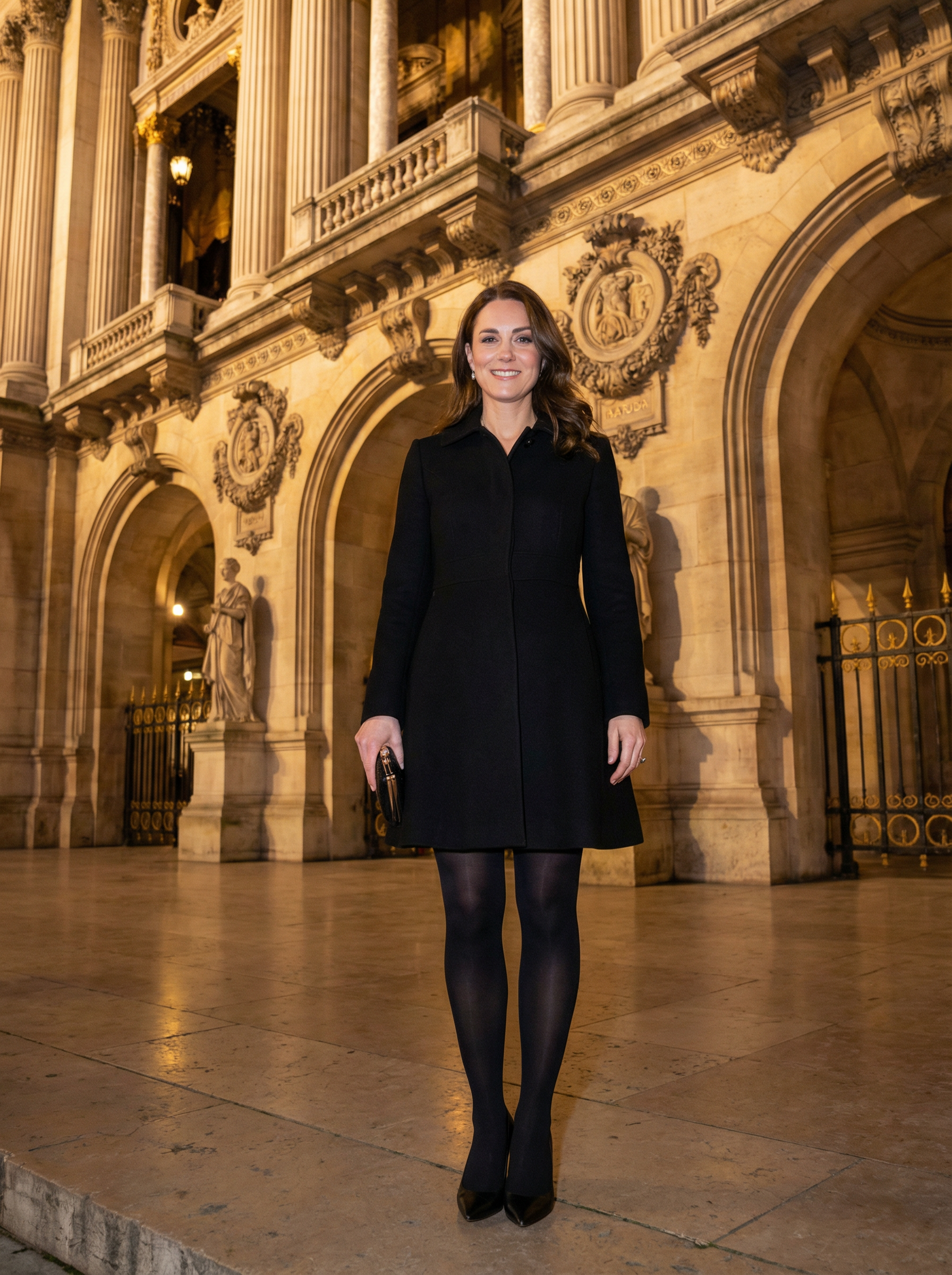 model in sophisticated coat dress, tights, pumps, clutch bag at Opéra Garnier entrance, grand architectural backdrop, ornate building details, elegant evening attire, cultural sophistication, dramatic architectural lighting