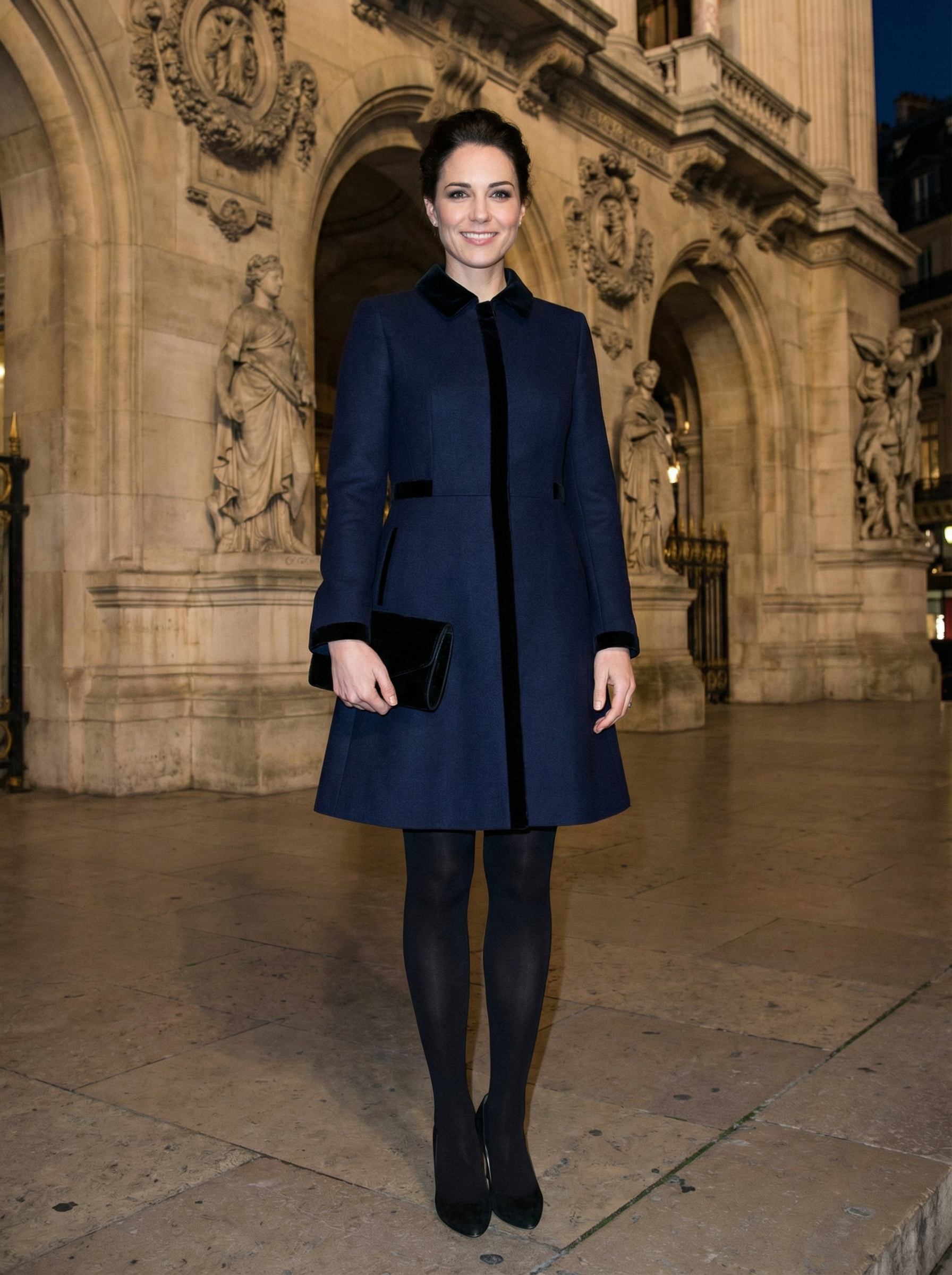 model in sophisticated coat dress, tights, pumps, clutch bag at Opéra Garnier entrance, grand architectural backdrop, ornate building details, elegant evening attire, cultural sophistication, dramatic architectural lighting