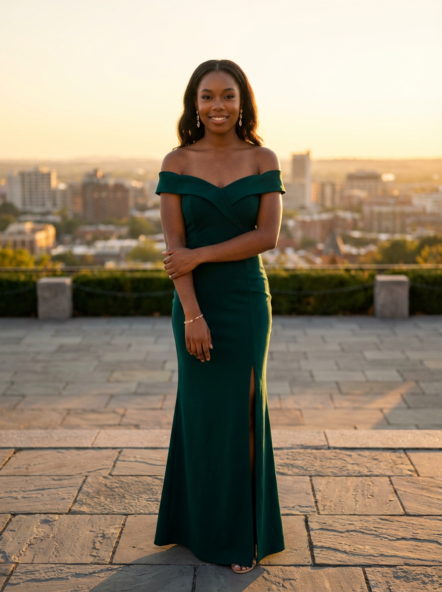 model in sophisticated evening wear , radiating allure under the soft glow of a sunset