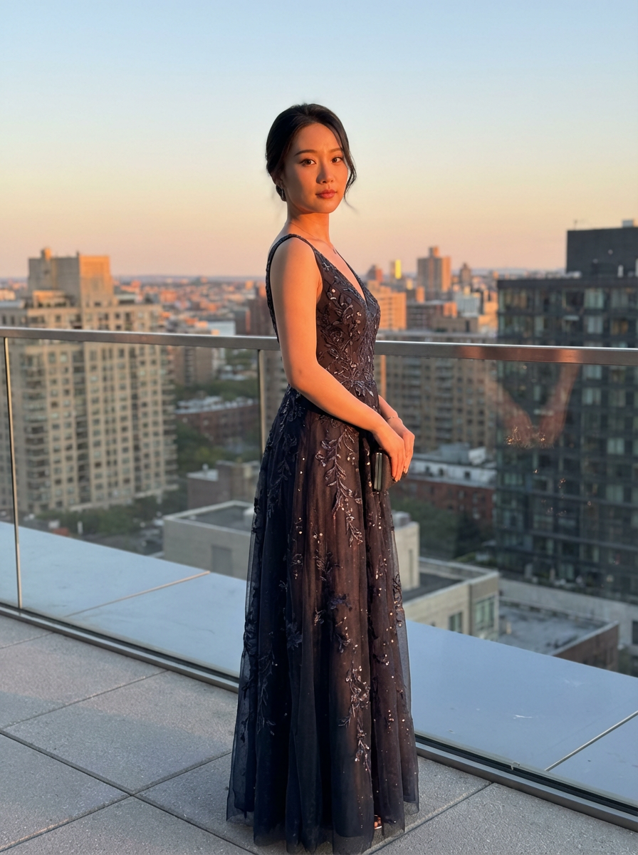 model in sophisticated evening wear , radiating allure under the soft glow of a sunset