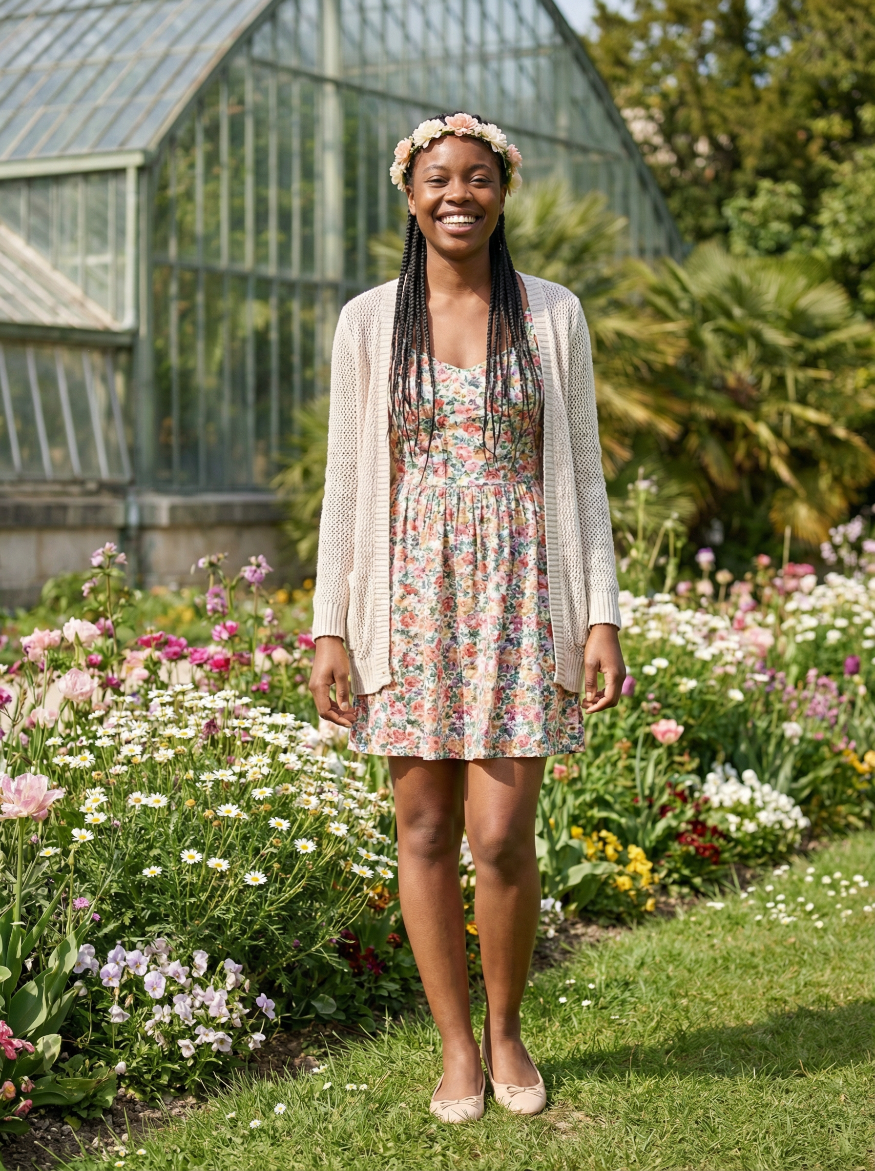 model in spring dress, light cardigan, ballet flats, flower crown in Jardin des Plantes botanical garden, blooming flowers everywhere, greenhouse in background, spring garden beauty, natural lighting, botanical paradise