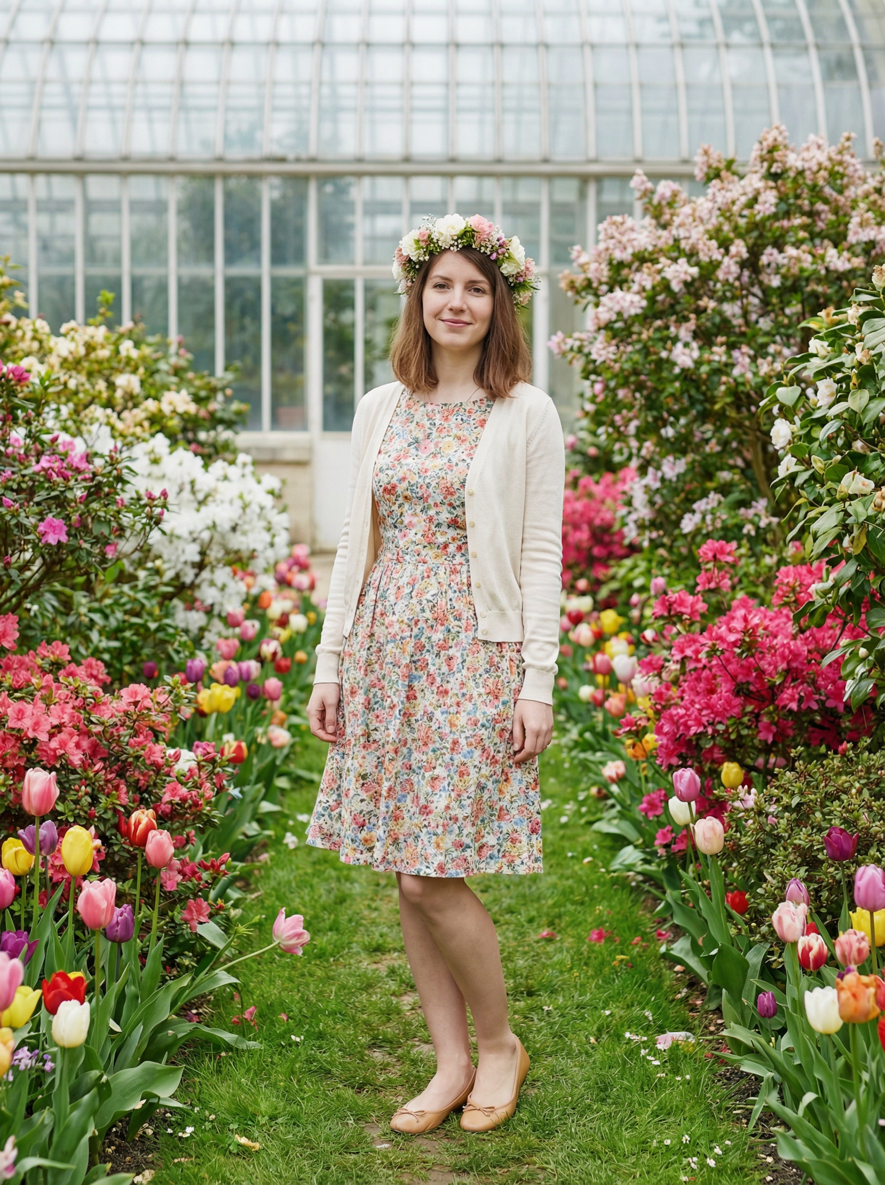 model in spring dress, light cardigan, ballet flats, flower crown in Jardin des Plantes botanical garden, blooming flowers everywhere, greenhouse in background, spring garden beauty, natural lighting, botanical paradise