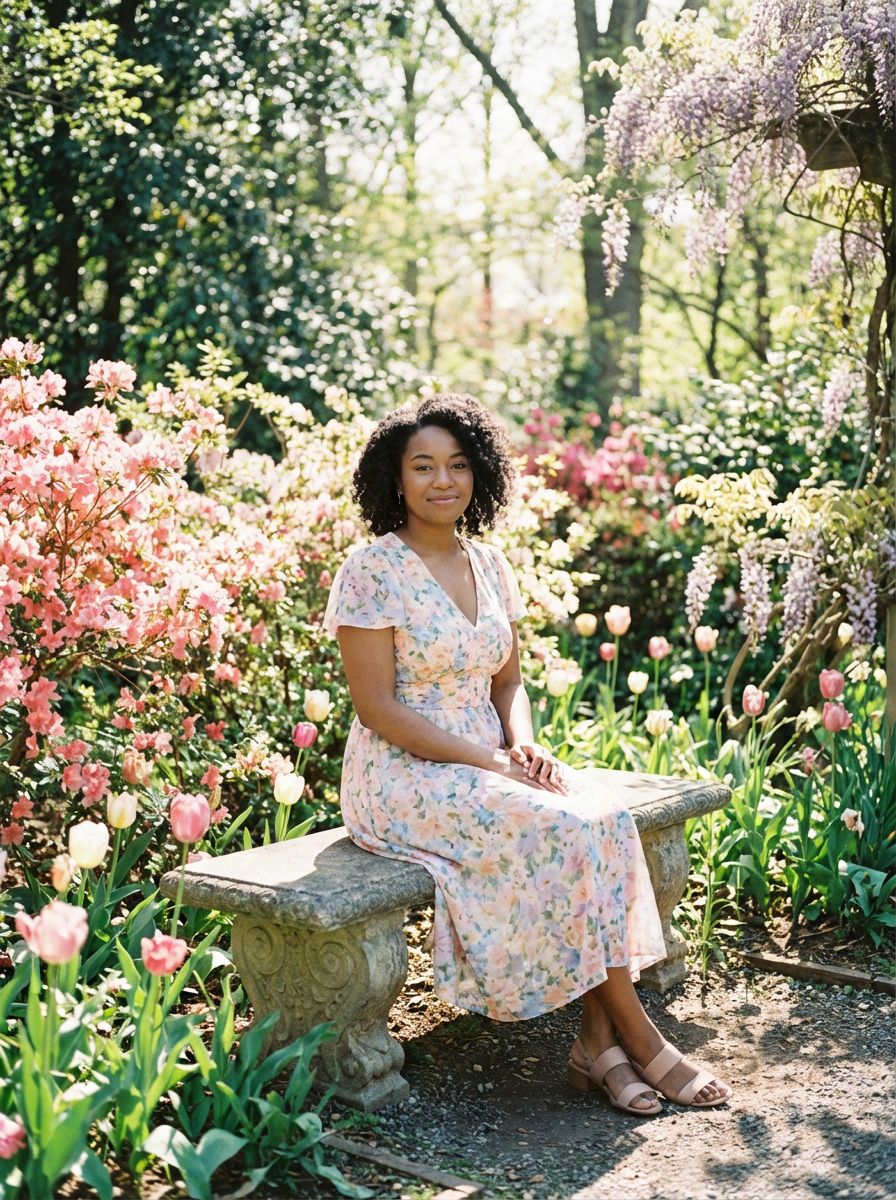 model in spring garden, surrounded by blooming flowers, floral dress , peaceful moment