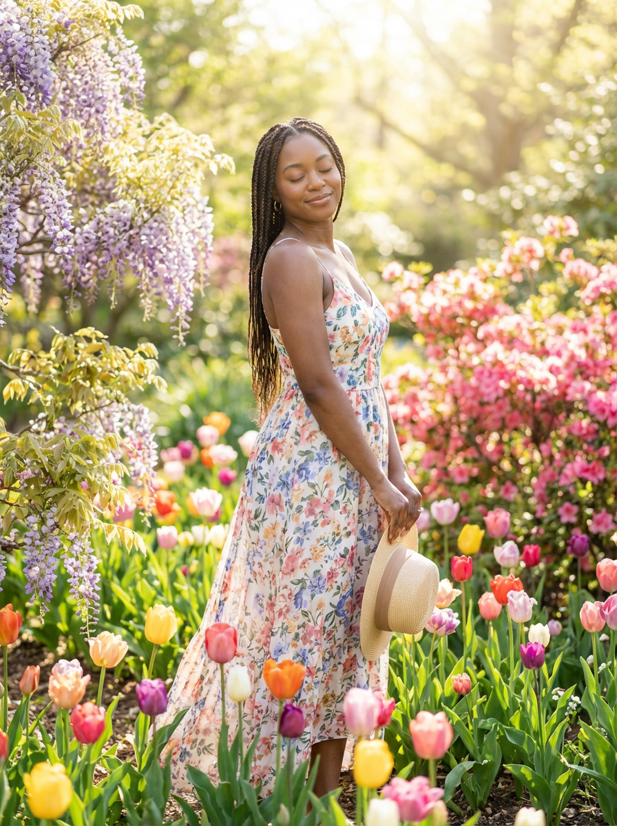 model in spring garden, surrounded by blooming flowers, floral dress , peaceful moment