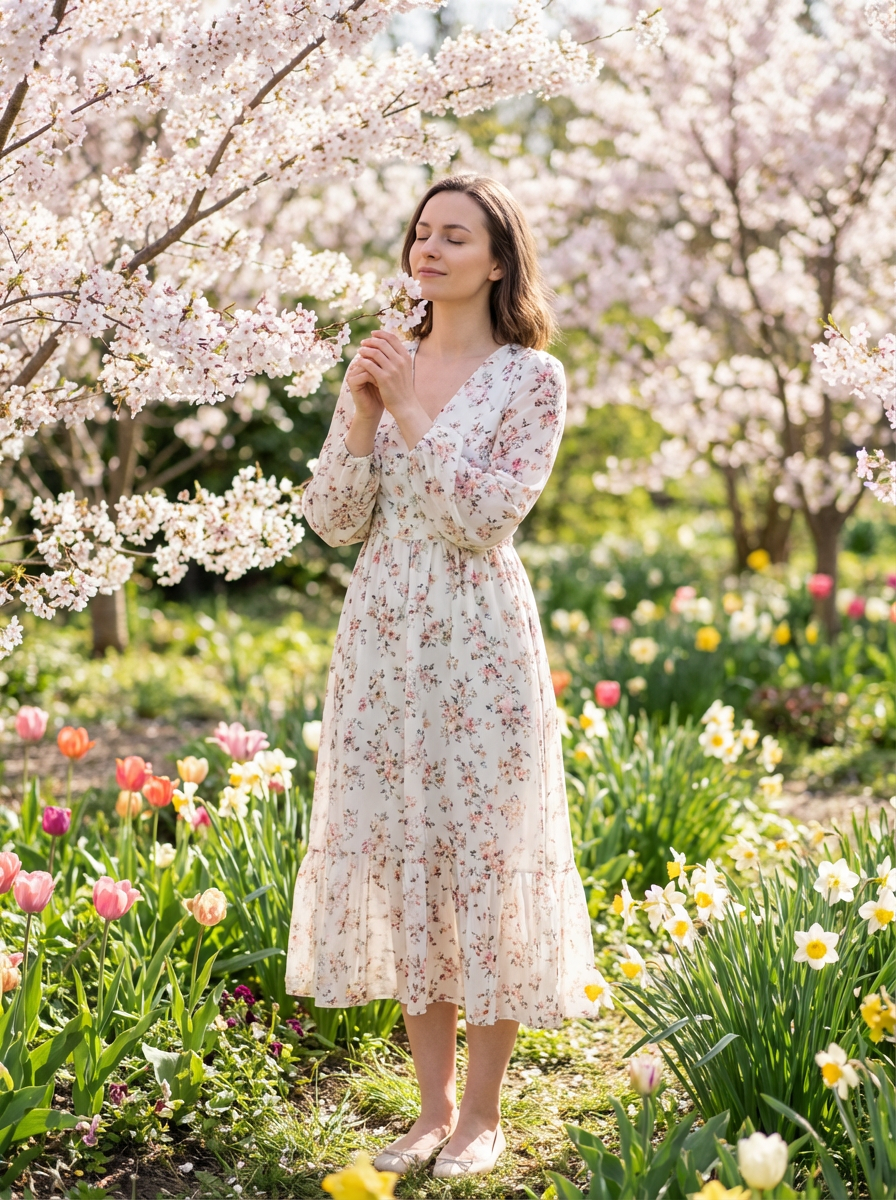 model in spring garden, surrounded by blooming flowers, floral dress , peaceful moment
