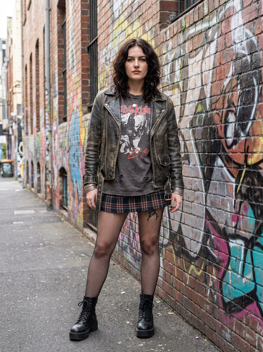 model in stylish alternative fashion, confident self-expression, urban artistic background