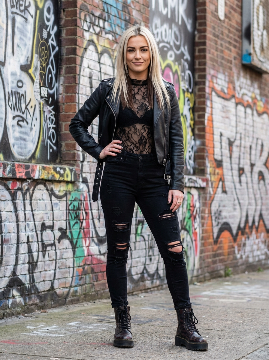 model in stylish alternative fashion, confident self-expression, urban artistic background