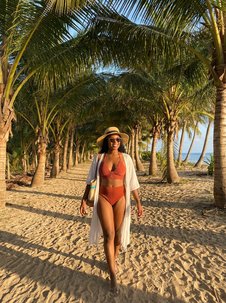 model in stylish beachwear walking through tunnel of palm trees, golden sunlight filtering through