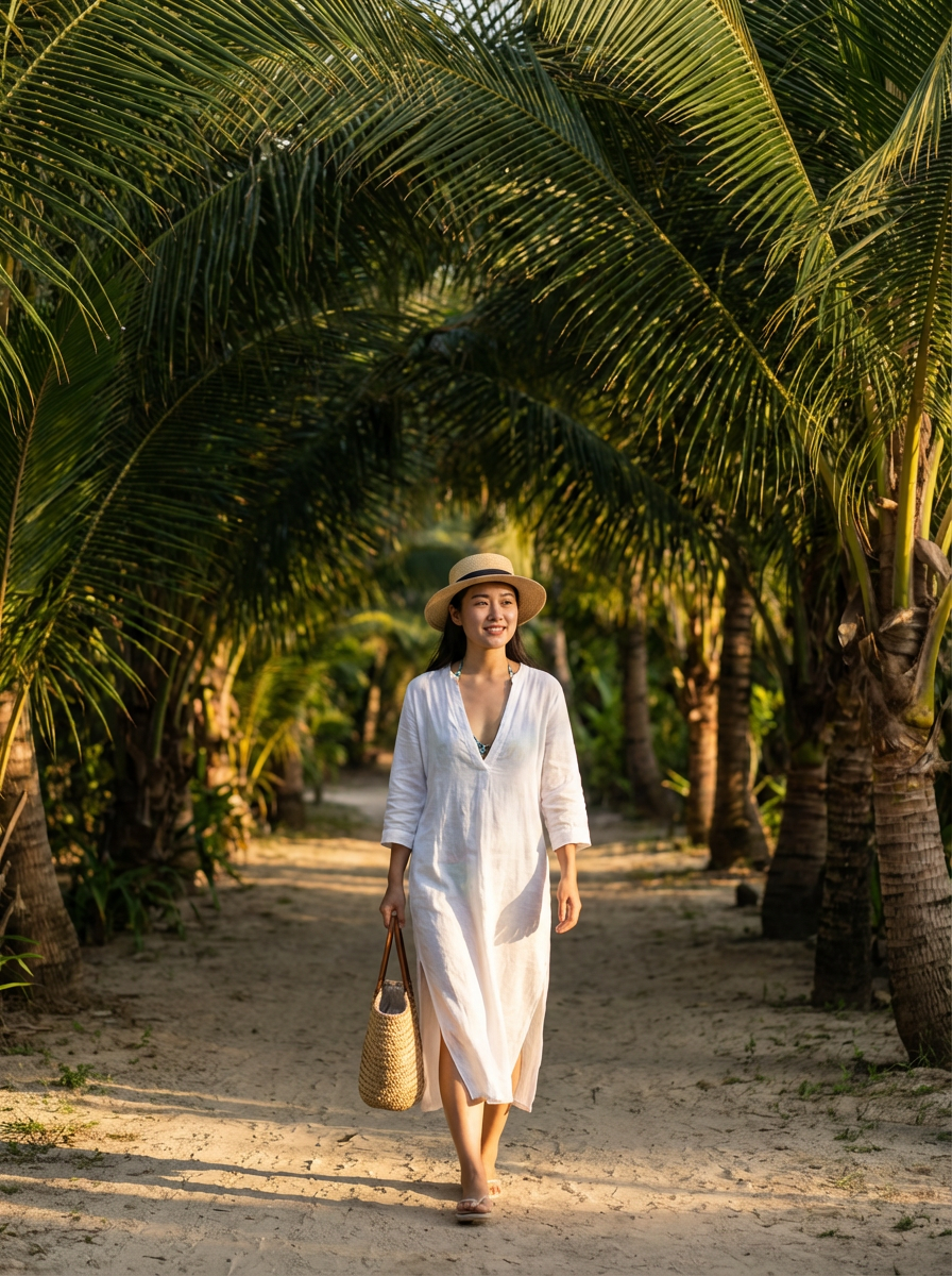 model in stylish beachwear walking through tunnel of palm trees, golden sunlight filtering through