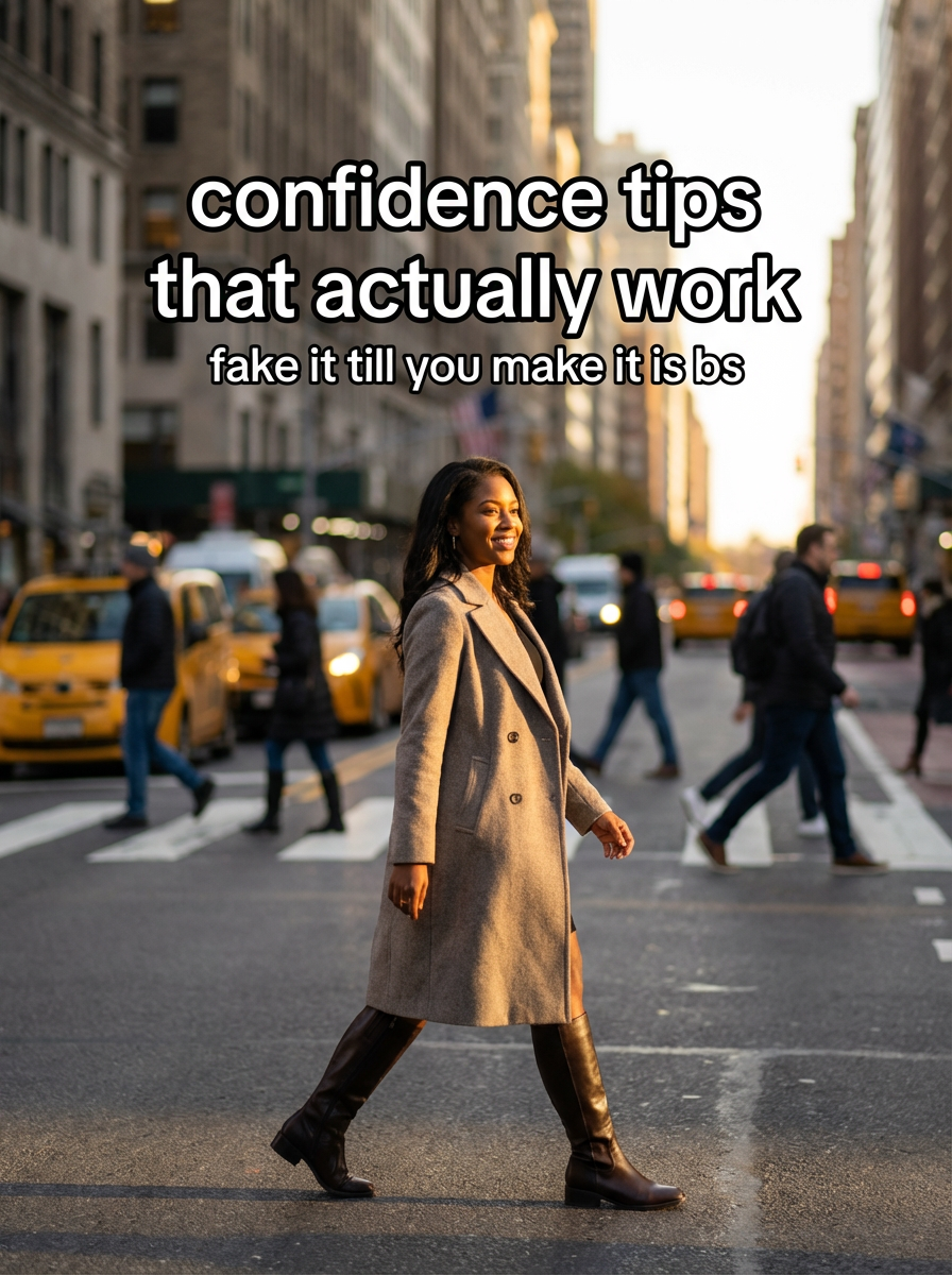model in stylish coat and boots walking through busy city street, confident stride, urban backdrop, golden hour lighting. TikTok text overlay: "confidence tips that actually work" smaller text: "(fake it till you make it is bs)" , do not show tiktok interface