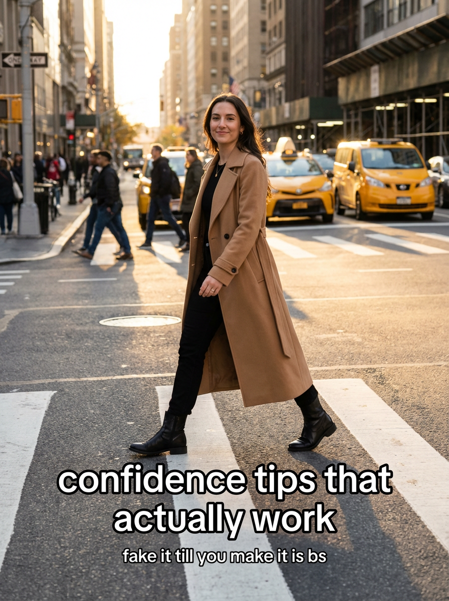model in stylish coat and boots walking through busy city street, confident stride, urban backdrop, golden hour lighting. TikTok text overlay: "confidence tips that actually work" smaller text: "(fake it till you make it is bs)" , do not show tiktok interface
