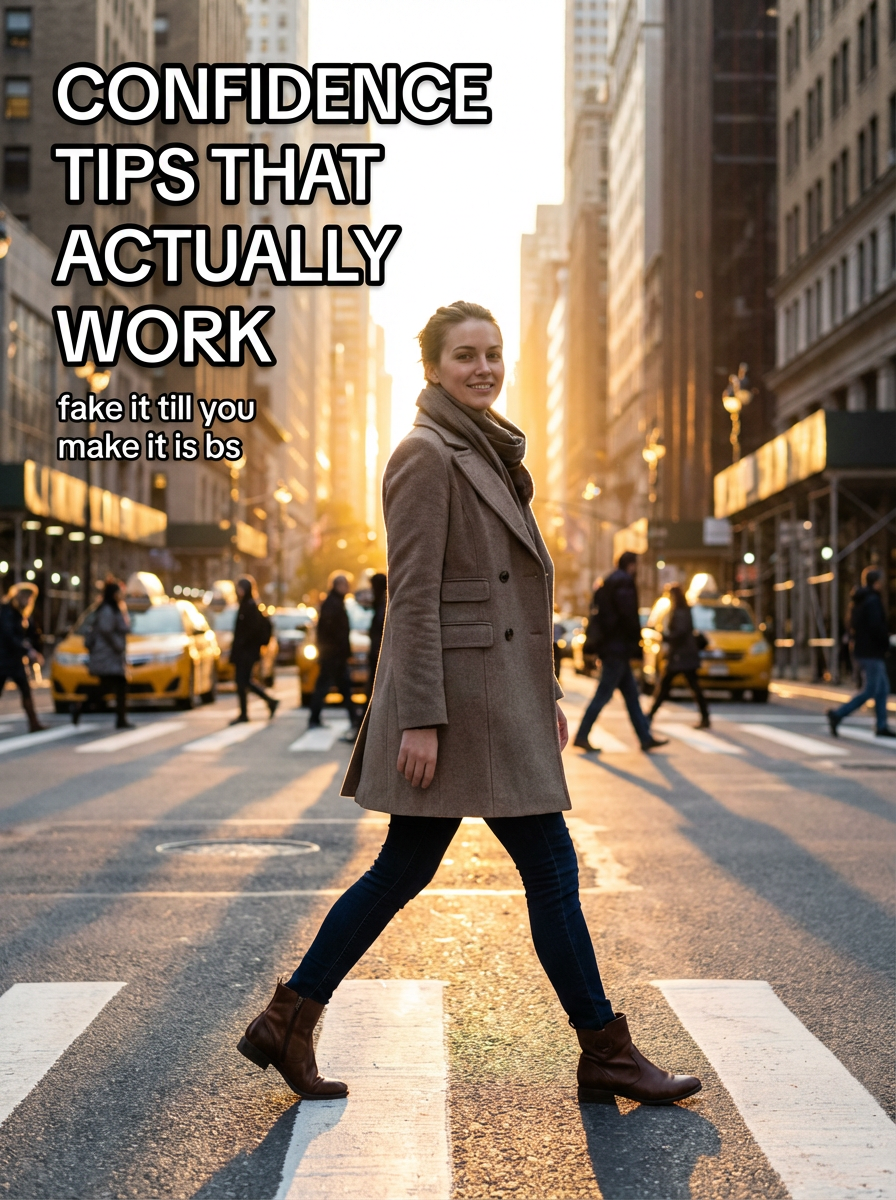 model in stylish coat and boots walking through busy city street, confident stride, urban backdrop, golden hour lighting. TikTok TikTok-style text overlay with white text with black outline: "confidence tips that actually work" smaller text: "(fake it till you make it is bs)" , do not show tiktok interface or logo