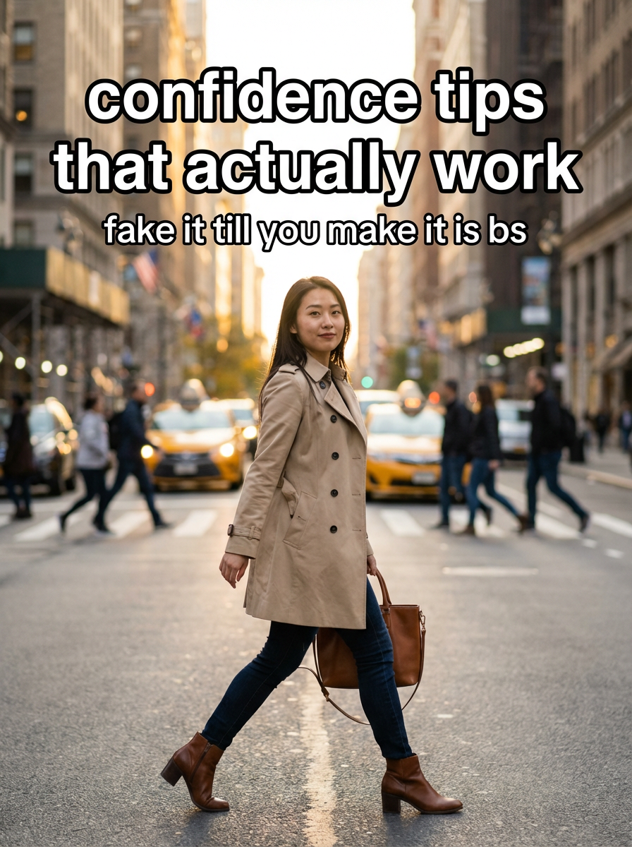 model in stylish coat and boots walking through busy city street, confident stride, urban backdrop, golden hour lighting. TikTok TikTok-style text overlay with white text with black outline: "confidence tips that actually work" smaller text: "(fake it till you make it is bs)" , do not show tiktok interface or logo
