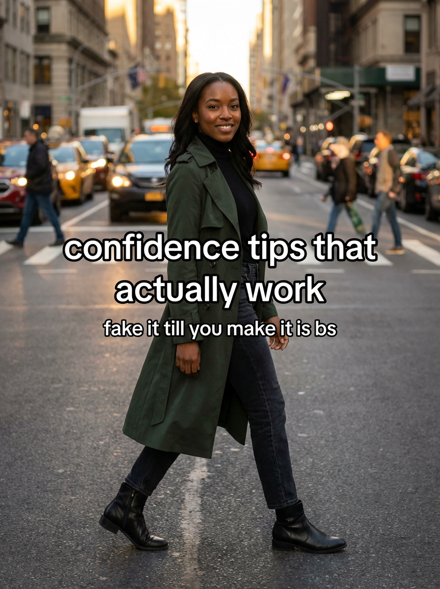 model in stylish coat and boots walking through busy city street, confident stride, urban backdrop, golden hour lighting. TikTok TikTok-style text overlay with white text with black outline: "confidence tips that actually work" smaller text: "(fake it till you make it is bs)" , do not show tiktok interface or logo