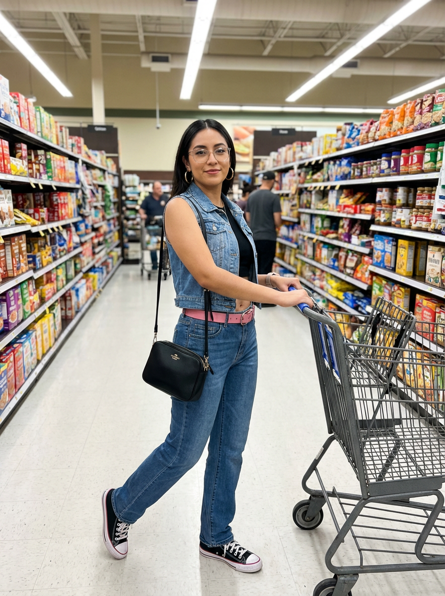 model in Supermarket walking with Shopping Cart in the Supermarket Aisle. Background of Supermarket