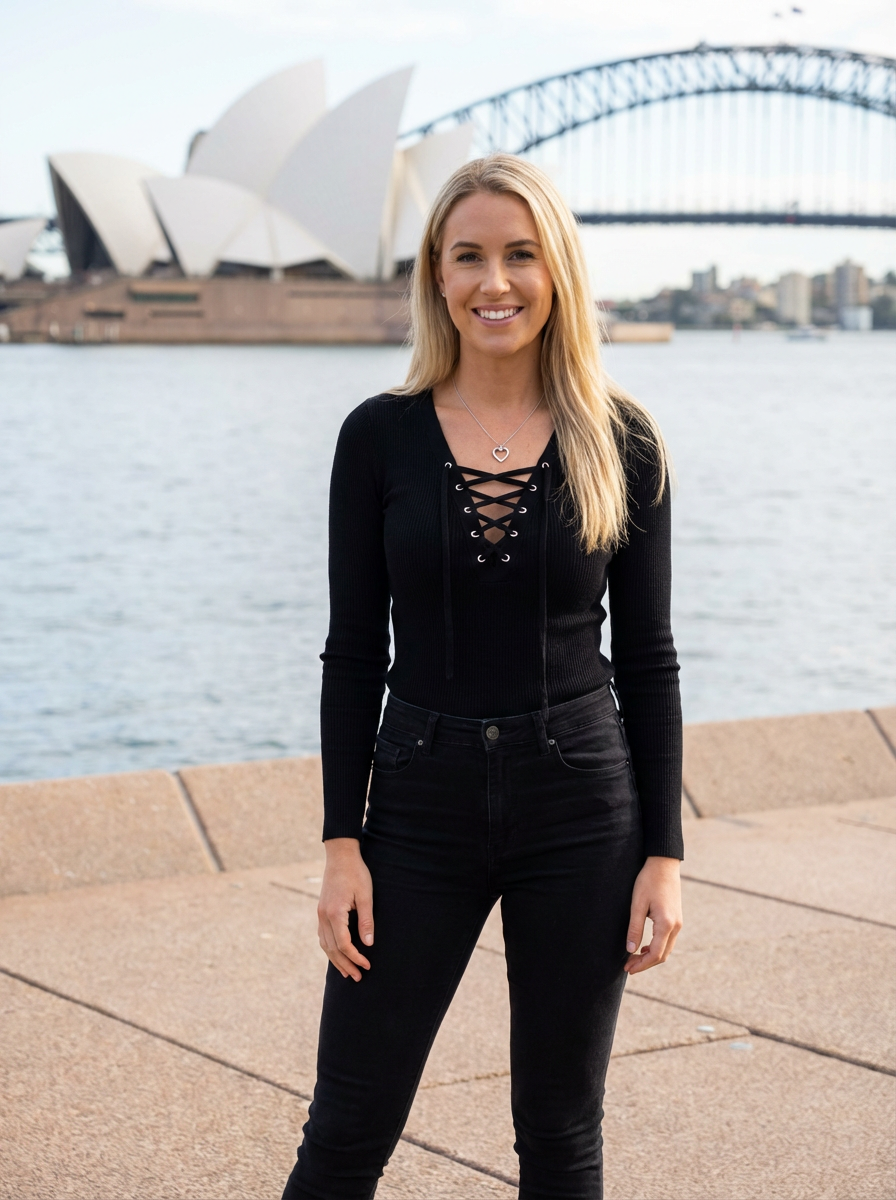 model in Sydney with the Sydney Opera House in the background