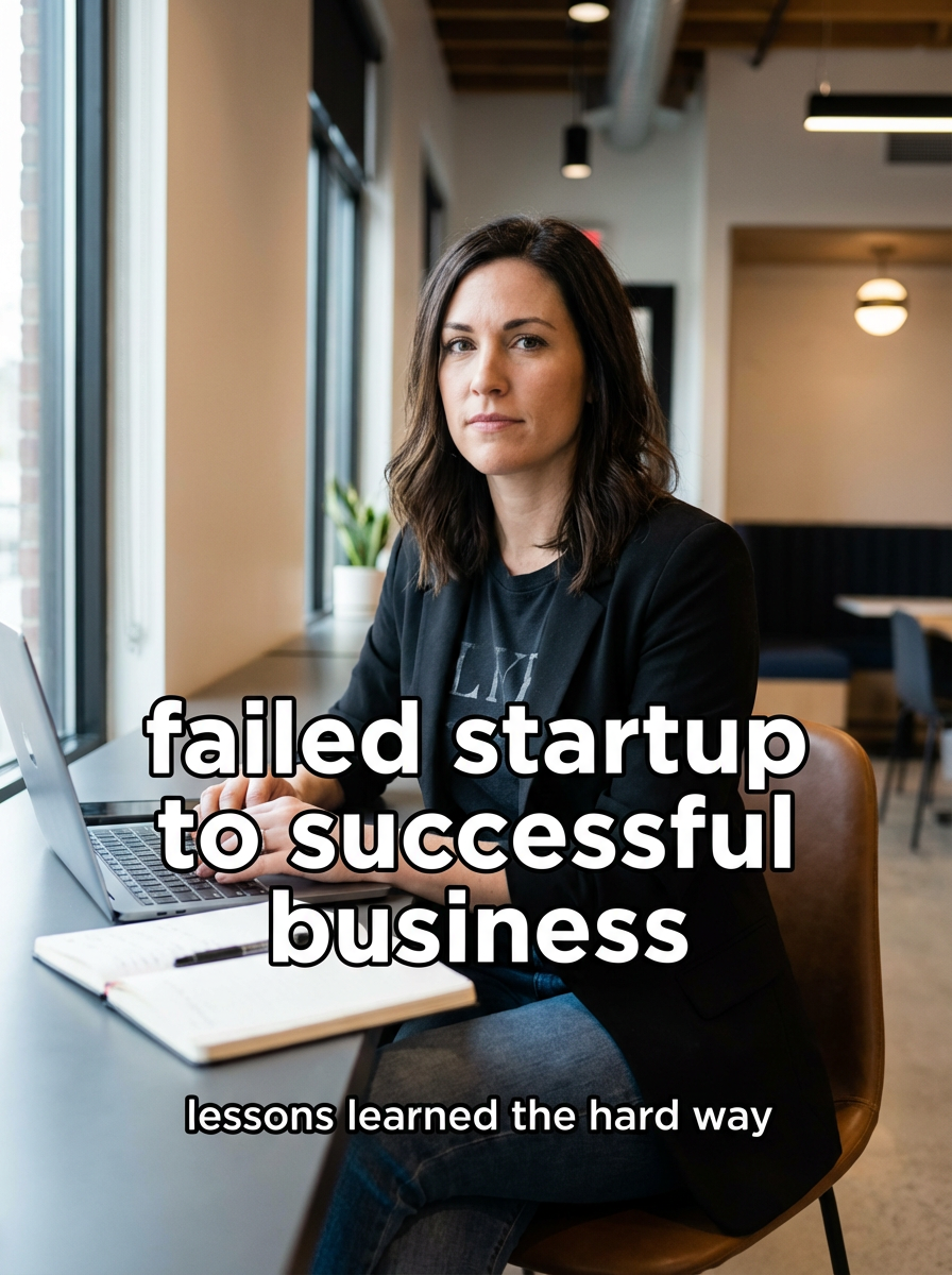 model in tech startup outfit in modern co-working space, laptop and notes, determined expression, innovative lighting. TikTok-style text overlay with white text with black outline: "failed startup to successful business" smaller text: "(lessons learned the hard way)" , do not show tiktok interface or logo