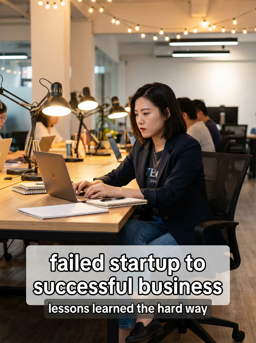 model in tech startup outfit in modern co-working space, laptop and notes, determined expression, innovative lighting. TikTok-style text overlay with white text with black outline: "failed startup to successful business" smaller text: "(lessons learned the hard way)" , do not show tiktok interface or logo
