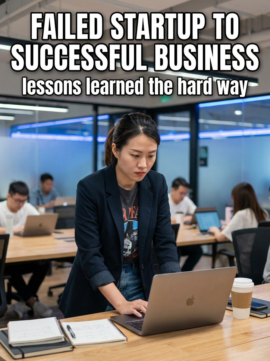 model in tech startup outfit in modern co-working space, laptop and notes, determined expression, innovative lighting. TikTok-style text overlay with white text with black outline: "failed startup to successful business" smaller text: "(lessons learned the hard way)" , do not show tiktok interface or logo