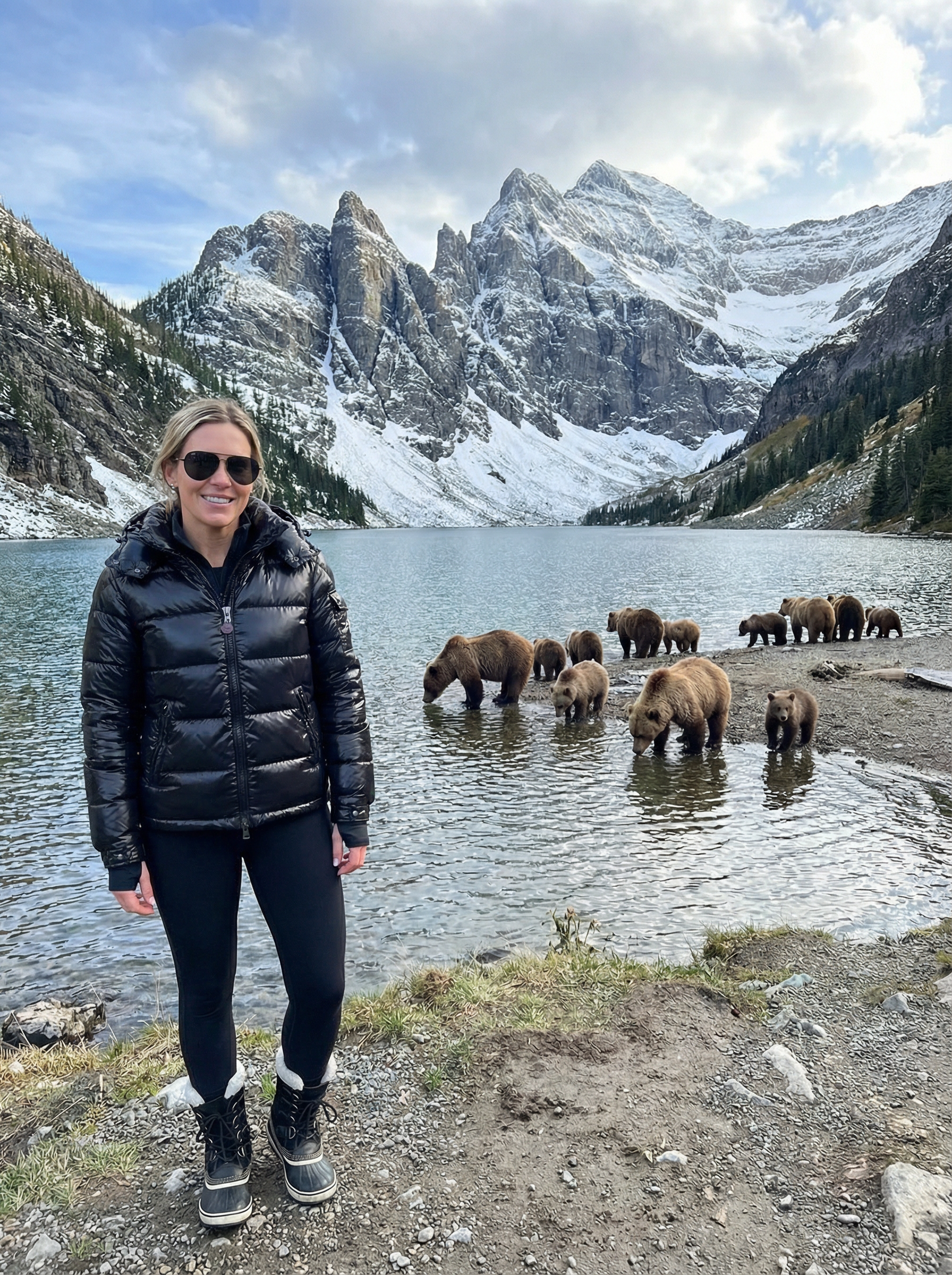 model in technical luxe: glossy puffer, leggings, winter boots, sunglasses at a pristine mountain lake with dramatic peaks behind, 15 bears (mother and cubs) peacefully drinking water nearby at a safe distance, cinematic wilderness editorial, crisp air lighting, photorealistic detail