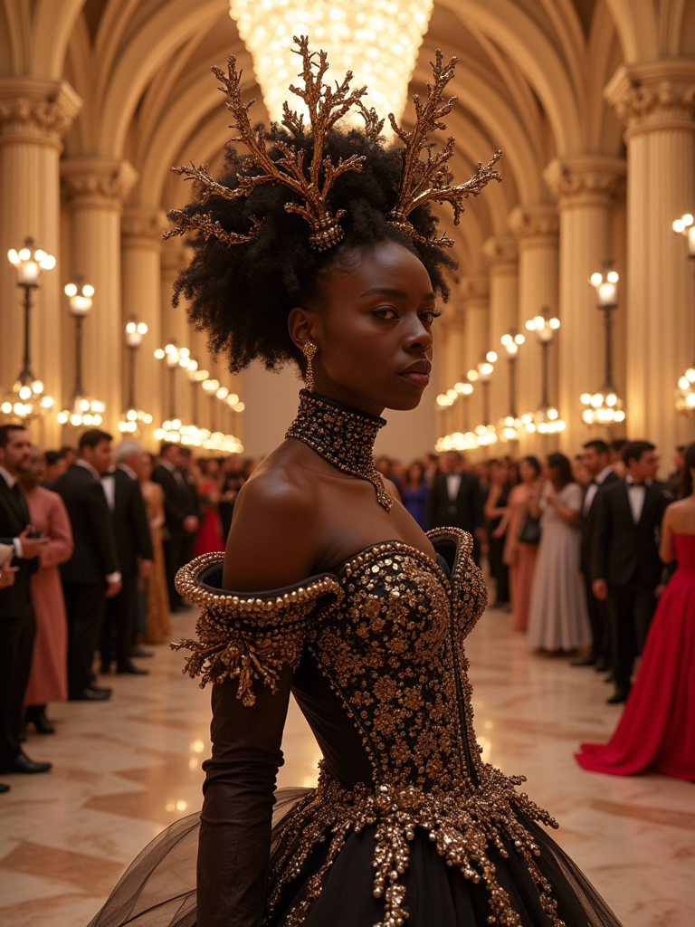 model in the Met Museum's grand hall transformed for the gala, wearing a fantasy-inspired couture creation with handcrafted details , surrounded by spectacular themed decorations and lighting