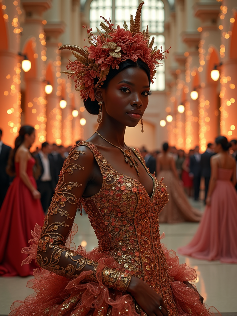 model in the Met Museum's grand hall transformed for the gala, wearing a fantasy-inspired couture creation with handcrafted details , surrounded by spectacular themed decorations and lighting