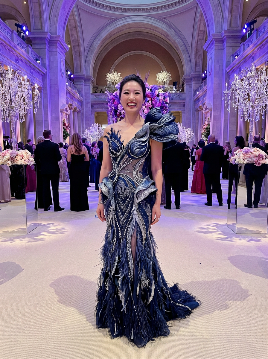 model in the Met Museum's grand hall transformed for the gala, wearing a fantasy-inspired couture creation with handcrafted details , surrounded by spectacular themed decorations and lighting