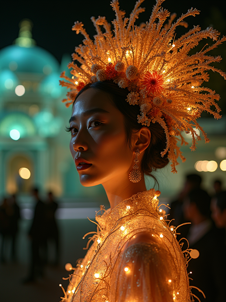 model in the museum's sculpture garden illuminated for the Met Gala, wearing a nature-inspired couture creation with organic textures , dramatic nighttime lighting and event decorations