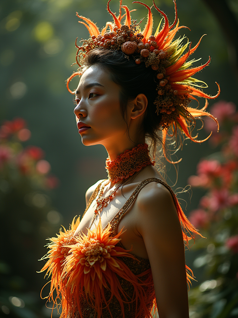 model in the museum's sculpture garden illuminated for the Met Gala, wearing a nature-inspired couture creation with organic textures , dramatic nighttime lighting and event decorations