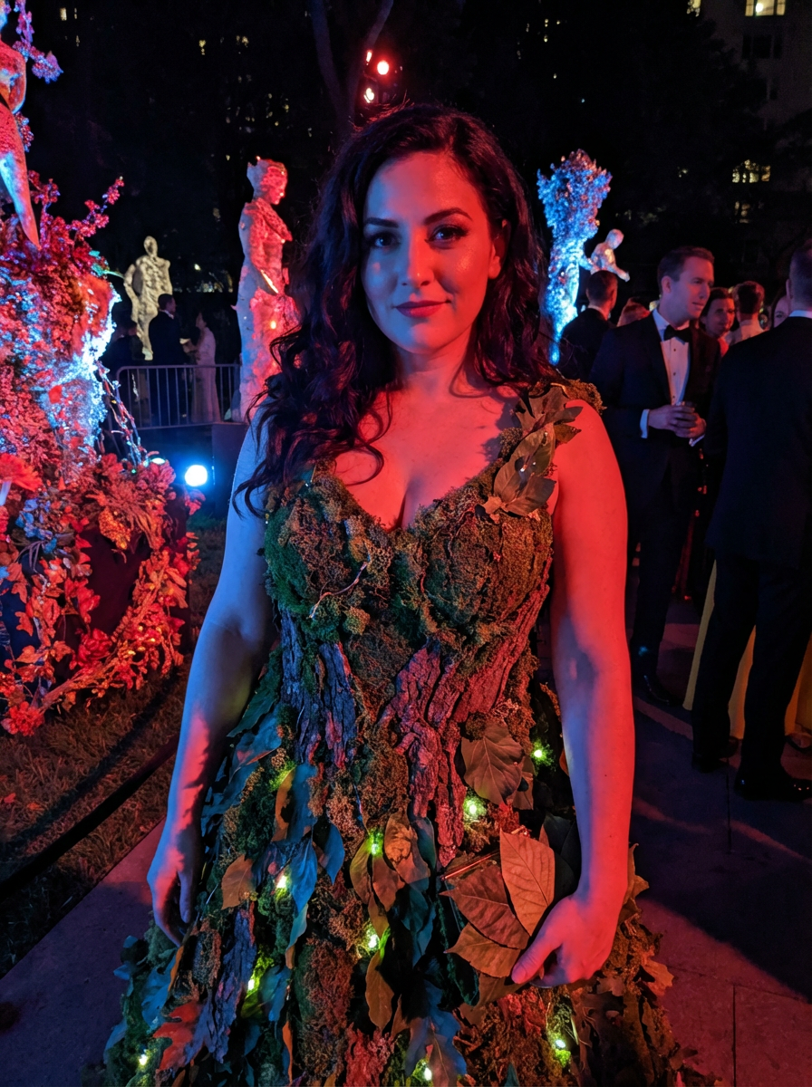model in the museum's sculpture garden illuminated for the Met Gala, wearing a nature-inspired couture creation with organic textures , dramatic nighttime lighting and event decorations