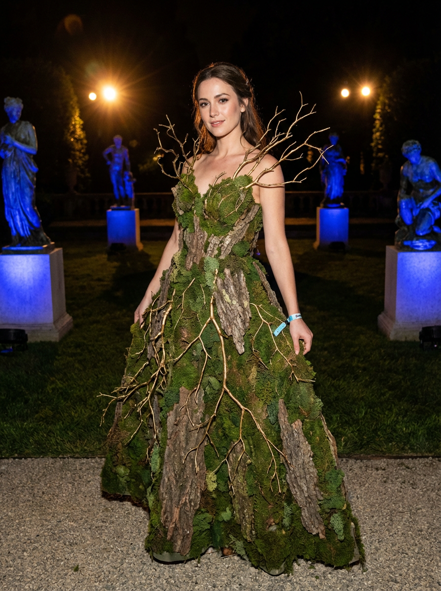 model in the museum's sculpture garden illuminated for the Met Gala, wearing a nature-inspired couture creation with organic textures , dramatic nighttime lighting and event decorations