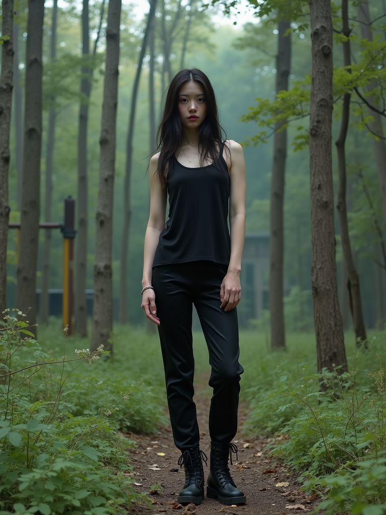 model in the overgrown Pripyat forest, trees towering over crumbling buildings and abandoned playgrounds in the background. wearing black boots and black pants and black tank top.