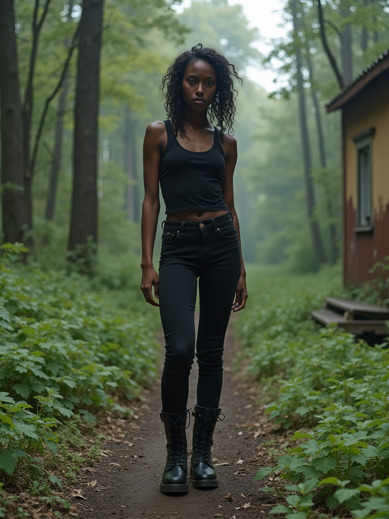 model in the overgrown Pripyat forest, trees towering over crumbling buildings and abandoned playgrounds in the background. wearing black boots and black pants and black tank top.