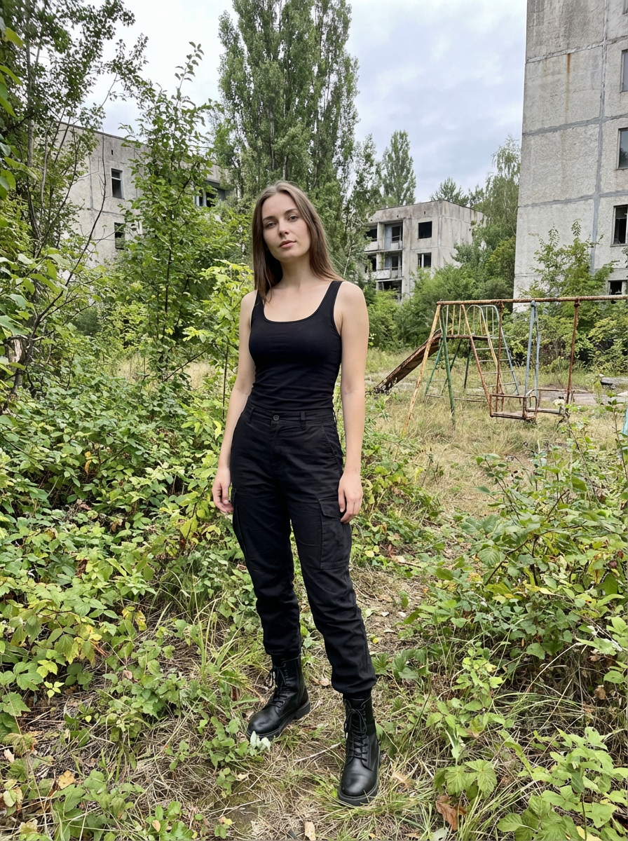 model in the overgrown Pripyat forest, trees towering over crumbling buildings and abandoned playgrounds in the background. wearing black boots and black pants and black tank top.