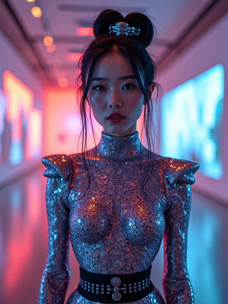 model in the themed exhibition space specially opened for the Met Gala, wearing a futuristic haute couture ensemble with technological elements , curated art displays with special event lighting