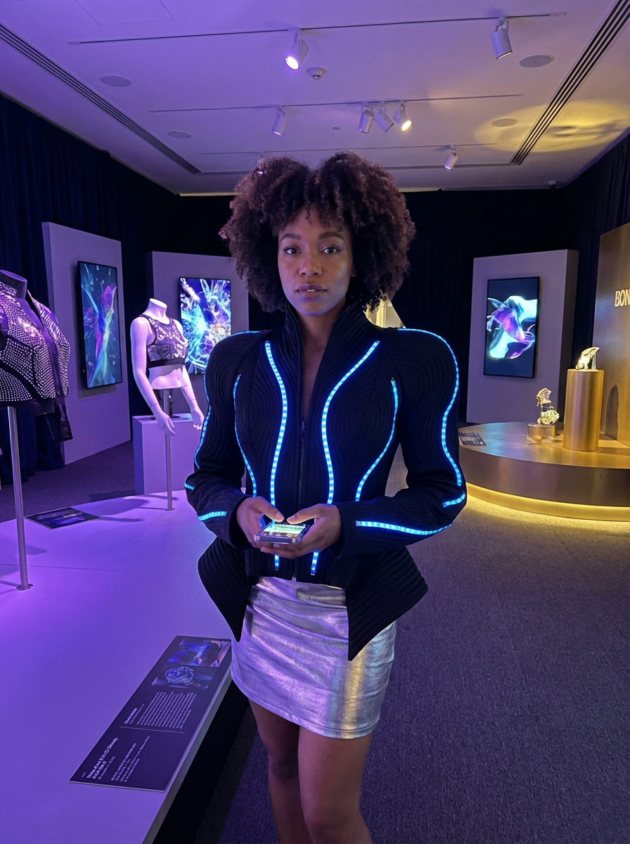 model in the themed exhibition space specially opened for the Met Gala, wearing a futuristic haute couture ensemble with technological elements , curated art displays with special event lighting