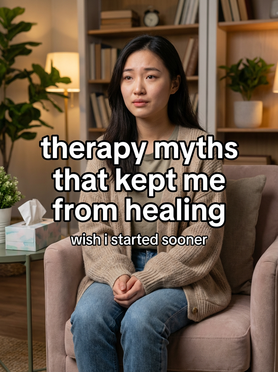model in therapy session outfit in cozy therapy office, tissues nearby, vulnerable but hopeful expression, soft lighting. TikTok TikTok-style text overlay with white text with black outline: "therapy myths that kept me from healing" smaller text: "(wish i started sooner)" , do not show tiktok interface or logo