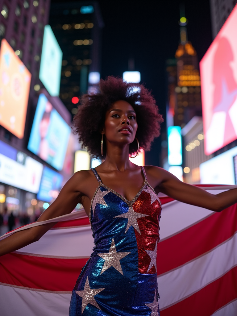 model in Times Square at night, surrounded by the iconic neon lights, wearing a glamorous sequined dress in bold red, white, and blue with star patterns , waving a large American flag, the bustling energy of New York City creating an electric patriotic atmosphere