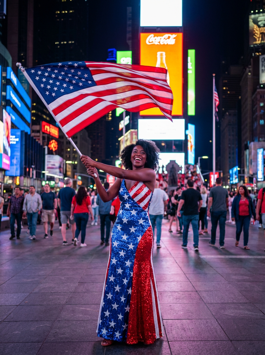 model in Times Square at night, surrounded by the iconic neon lights, wearing a glamorous sequined dress in bold red, white, and blue with star patterns , waving a large American flag, the bustling energy of New York City creating an electric patriotic atmosphere