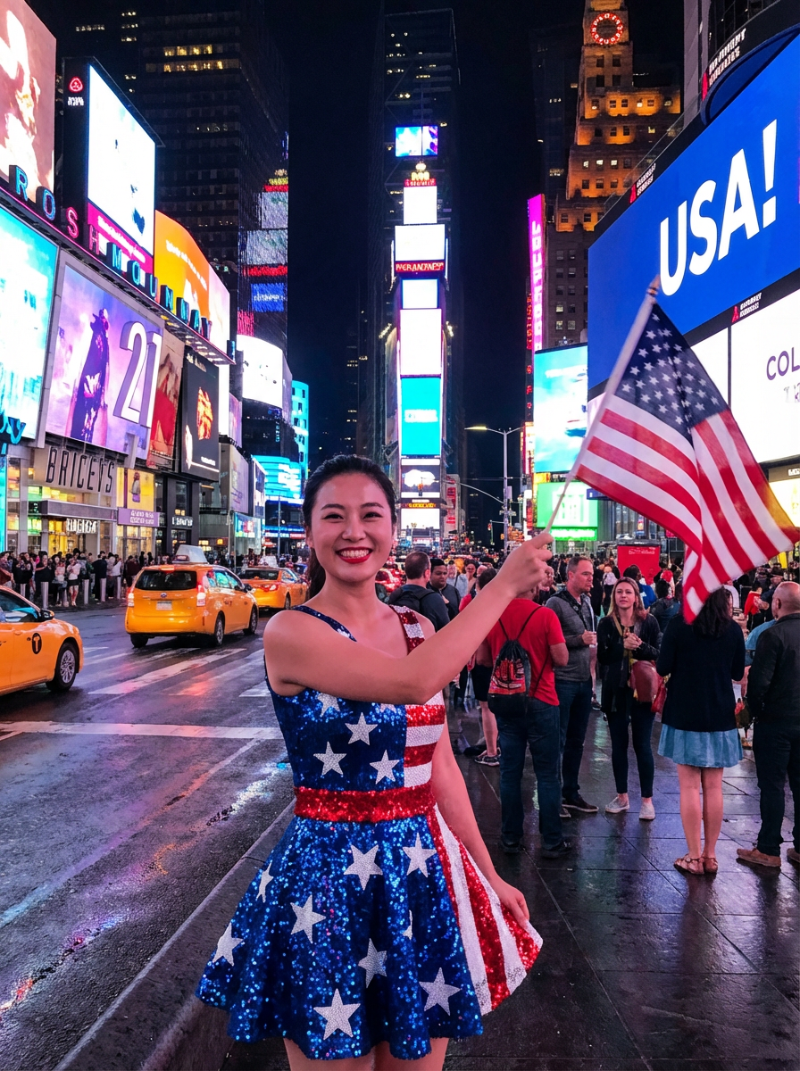 model in Times Square at night, surrounded by the iconic neon lights, wearing a glamorous sequined dress in bold red, white, and blue with star patterns , waving a large American flag, the bustling energy of New York City creating an electric patriotic atmosphere