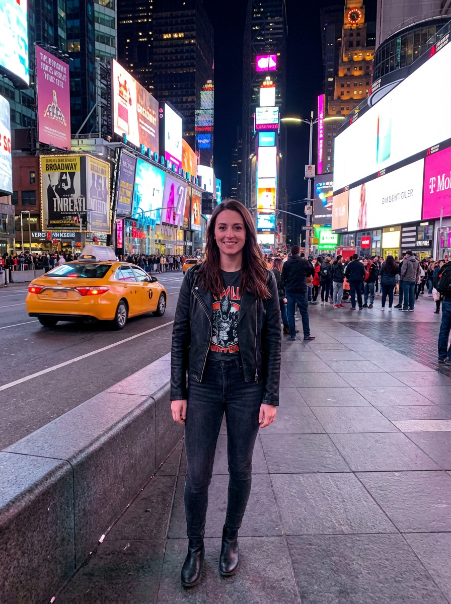 model in Times Square New York, bright billboards and lights, yellow taxi in background, stylish urban outfit, night scene
