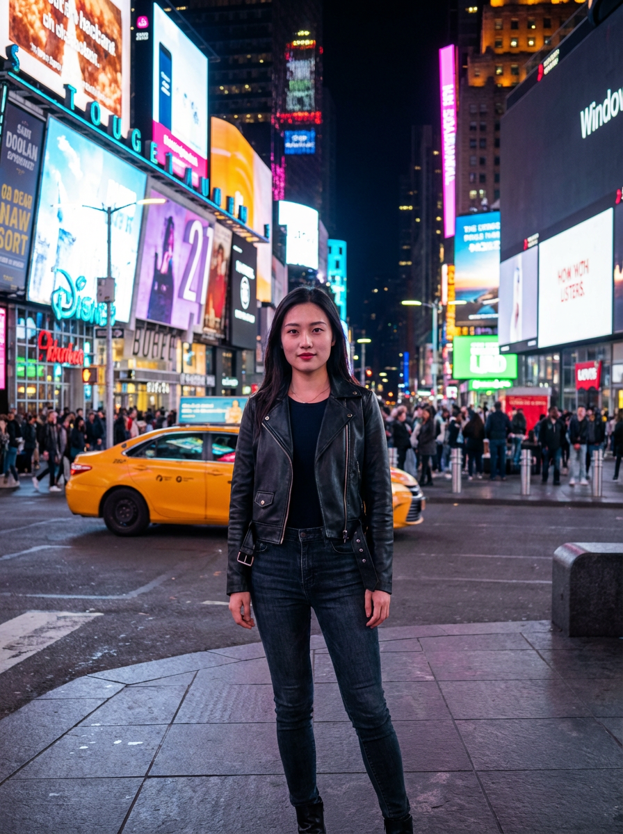 model in Times Square New York, bright billboards and lights, yellow taxi in background, stylish urban outfit, night scene