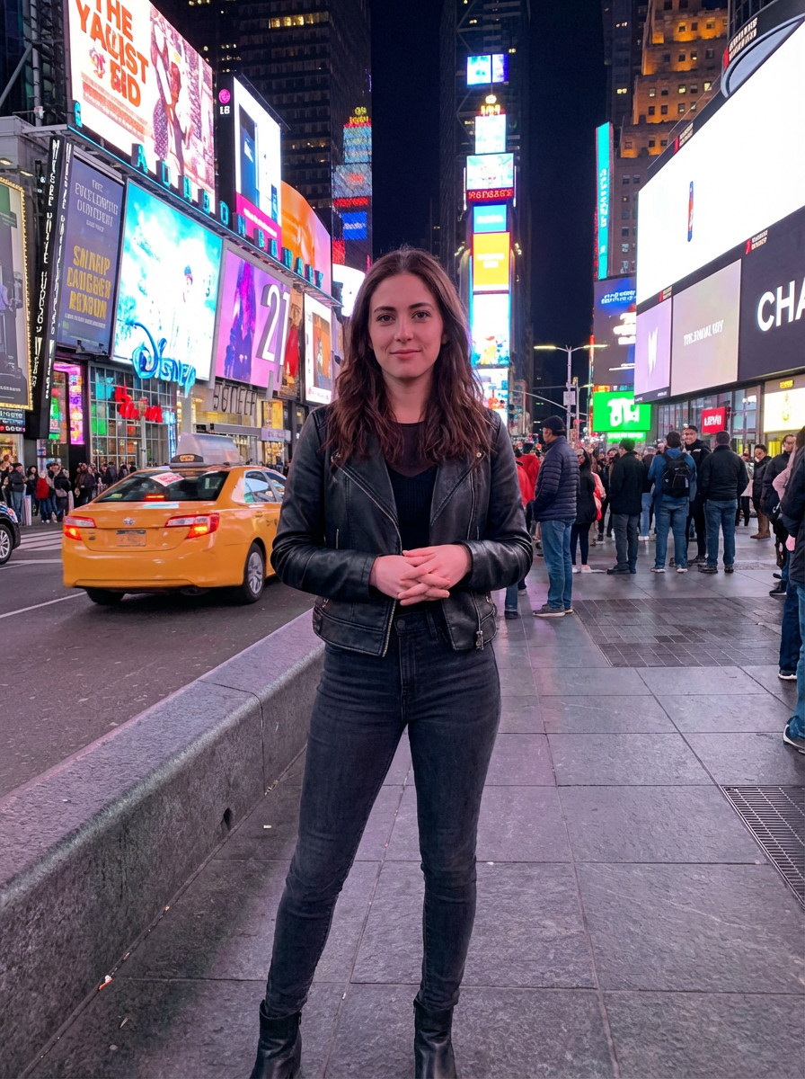 model in Times Square New York, bright billboards and lights, yellow taxi in background, stylish urban outfit, night scene