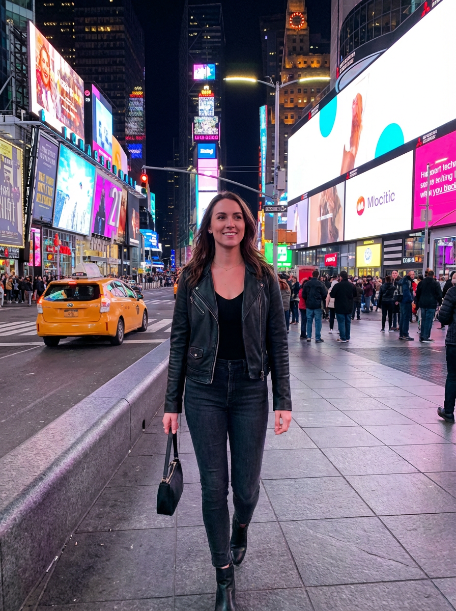 model in Times Square New York, bright billboards and lights, yellow taxi in background, stylish urban outfit, night scene