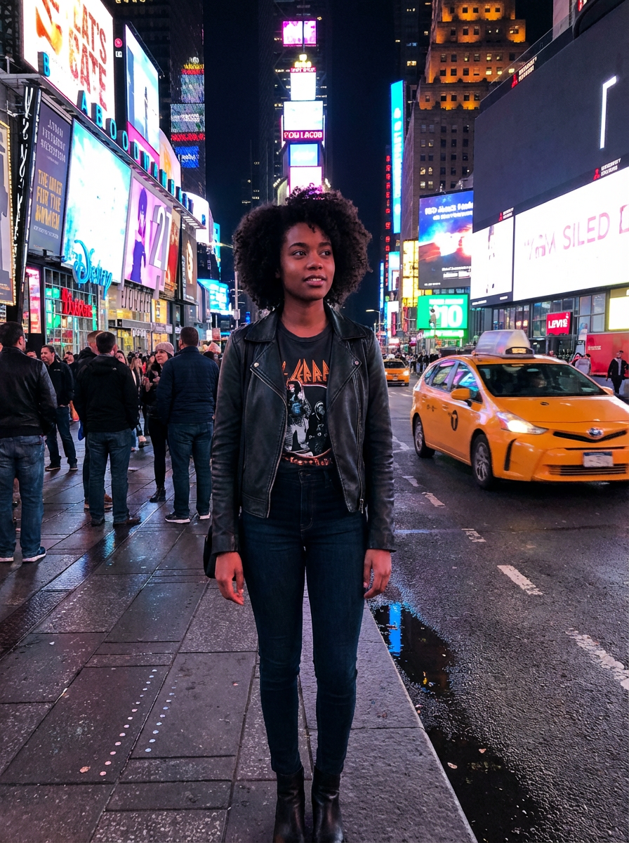 model in Times Square New York, bright billboards and lights, yellow taxi in background, stylish urban outfit, night scene